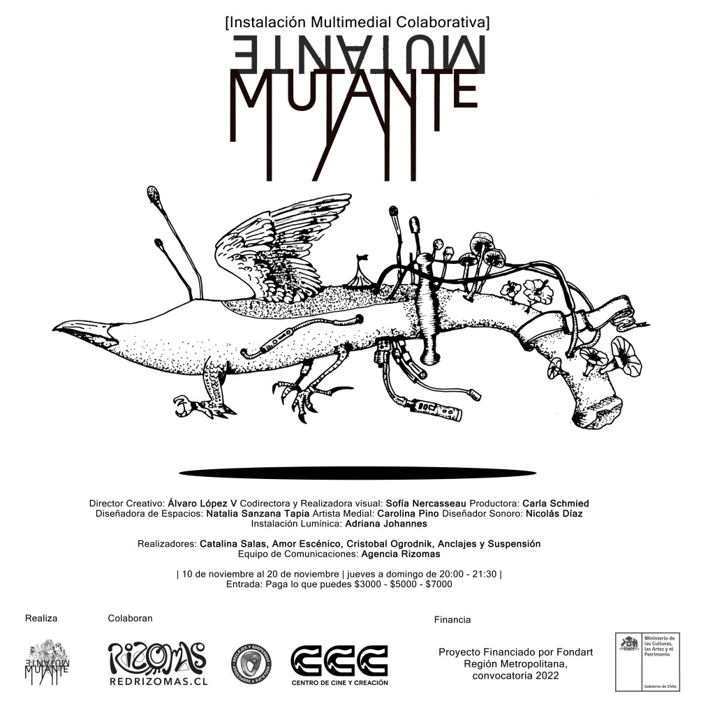 La Instalación Multimedial Colaborativa MUTANTE, es el proyecto de creación y producción artística que viene trabajando hace aproximadamente 1 año este colectivo y que invita a vivir una experiencia interdisciplinar para todo espectador, desde el ámbito de los nuevos medios, a partir de los contenidos alojados en la PlataformaMutante.com y fruto de una investigación colaborativa en red guiada por el equipo creador de esta iniciativa y que se construye junto a 23 artistas de distintas edades, territorios, regiones y disciplinas, a través de un trabajo de mediación artística en colegios y comunidades de la región Metropolitana.
