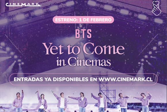 BTS ( 방탄소년단), la exitosa banda surcoreana de K-Pop regresa a Chile, aunque esta vez en formato cine, gracias a la proyección de «BTS-Yet to Come in Cinemas« en idioma original y subtitulada al español, en esta oportunidad se exhibirá en todas las salas Cinemark, durante los días miércoles 1 al sábado 4 de Febrero (con horarios disponibles en cada cine), funciones esperadas con ansias por las A.R.M.Y (Adorable Representative MC for Youth) que esperan agotar butacas en los complejos de Cinemark Chile.