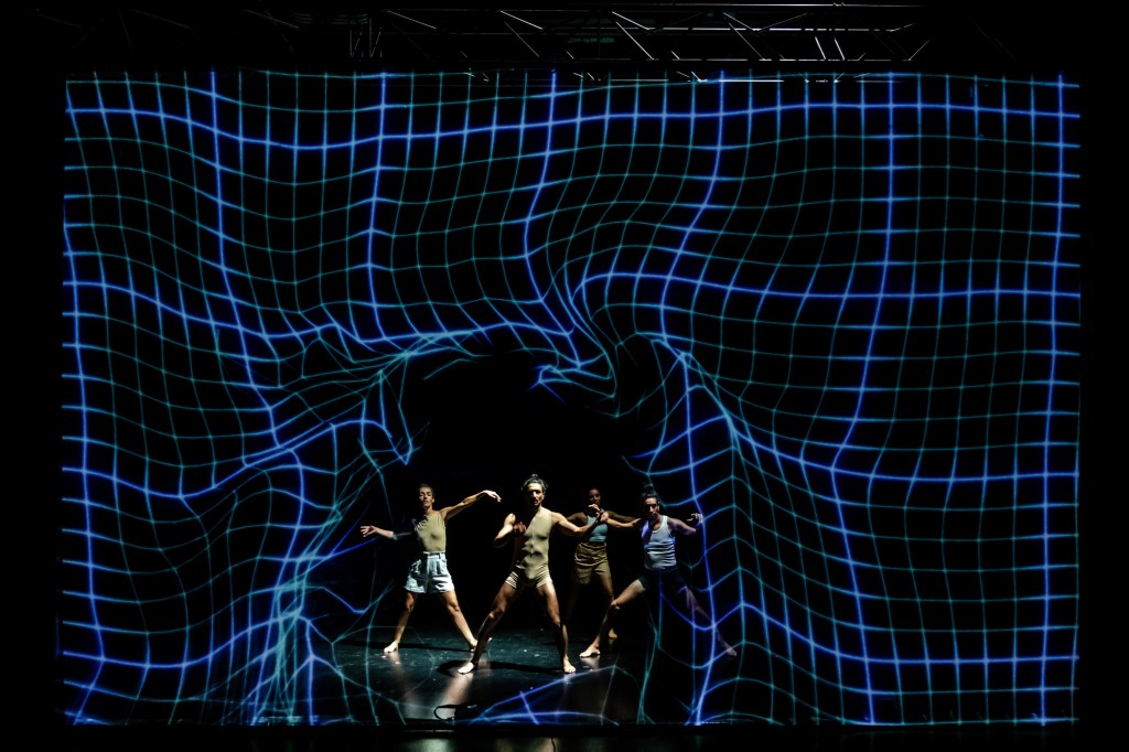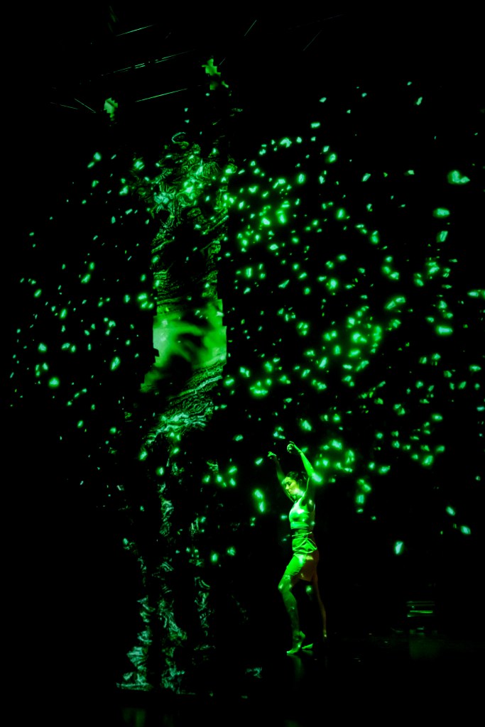 Este montaje especial consiste en una proyección frontal sobre una pantalla holográfica, donde los entornos visuales y objetos 3D se mapean en la superficie proyectiva, aumentando la realidad con una perspectiva de profundidad. La pantalla es semitransparente permitiendo una visualización de los contenidos digitales integrados con los cuerpos en escena. La obra contará con un sistema tecnológico que incluye sensores de movimiento, que permite obtener datos en tiempo real para un gran resultado de interacción e inmersión. El diseño que se presentará en esta pantalla son composiciones digitales donde los avatars de los performers serán representados por sistemas de partículas, en entornos inmersivos, con iluminación audio reactiva, movimientos 3D de cámara, efectos visuales y sonoros.