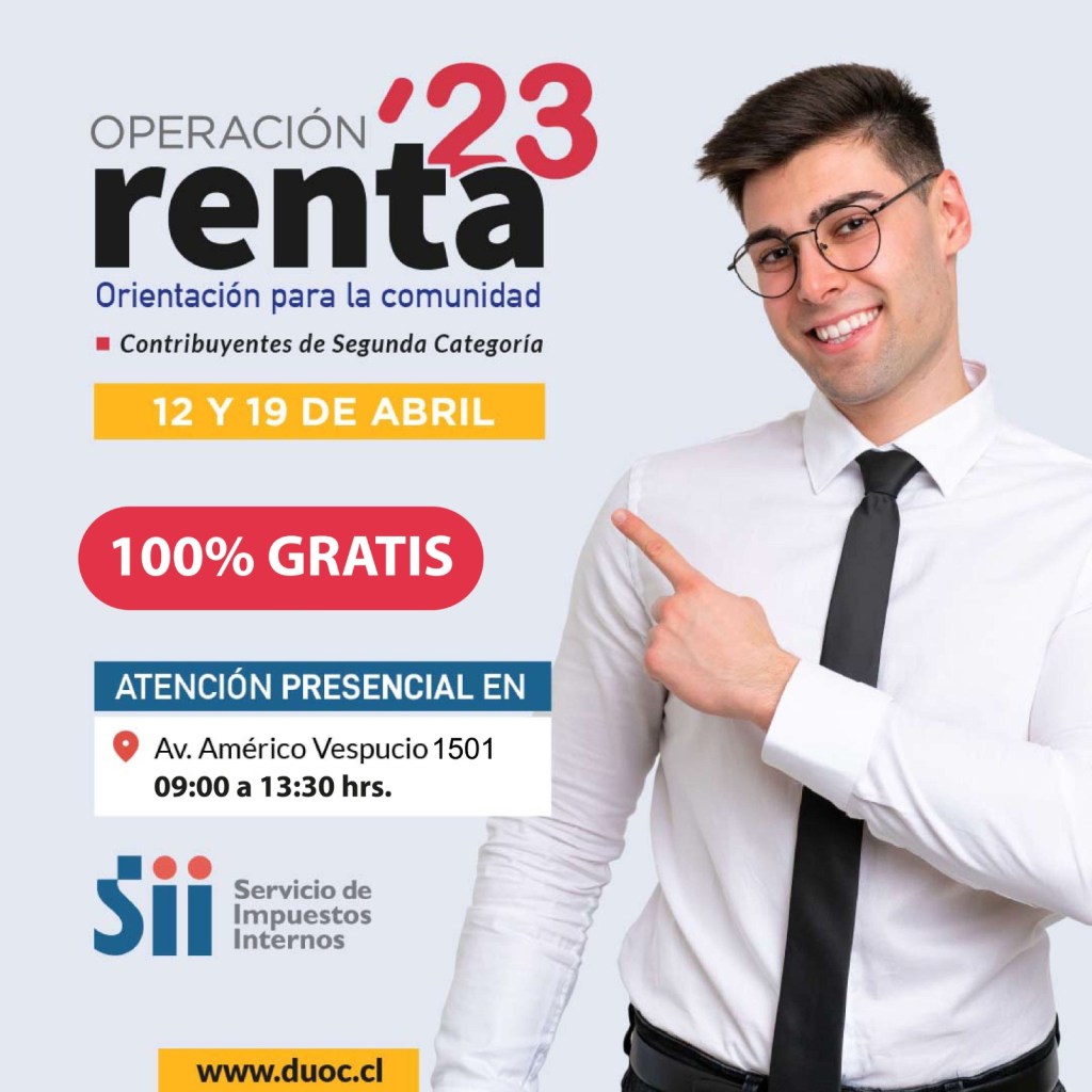 Presencial y dirigida a contribuyentes de segunda categoría es parte de la asesoría 100% gratuita que brindará Duoc UC Plaza Oeste para el proceso de Operación Renta 2023, este 12 y 19 de abril de 09:00 a 13:30 hrs.