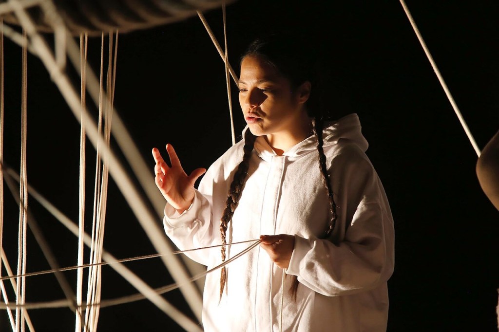 Desde el jueves 15 de junio -y con funciones los días 16, 17, 22, 23 y 24 del mes, en la sala de Teatro de la UniversidadMayor– Terrapolis exhibirá un telón de proyecciones junto a una estructura de rizoma tejido y orgánico. Mientras vemos imágenes en el telón, sucede una intervención de cuerdas que unen la sala y los cuerpos que recorren el espacio; cuerdas que serán tejidas por un grupo de mujeres de la costa norte de la V región mientras discuten cómo dar fin a la contaminación que amenaza sus vidas, las de sus hijos e hijas, y los bosques.