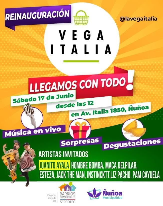 La actividad de reinauguración de la Vega Italia apunta a promover el comercio de la zona y se llevará a cabo como parte del programa Fortalecimiento de Barrios Comerciales de Sercotec, que busca mejorar el entorno comercial y urbano de los barrios comerciales del país a través de un trabajo colaborativo dirigido a potenciar el capital social. Este fortalecimiento económico del barrio se realiza en alianza con el Ministerio de Economía, Fomento y Turismo y la Municipalidad de Ñuñoa.