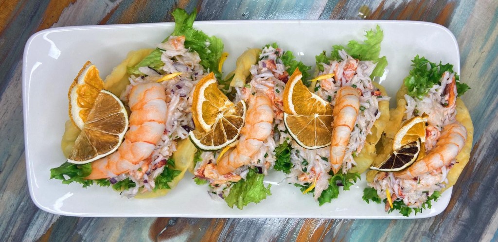 Los Tacos de Centolla combinan ingredientes y texturas alucinantes. Se trata de cuatro masas crujientes, rellenas de carne de centolla sobre una base de lechuga y camarón. Para realzar aún más los sabores, se sirven acompañados de salsa golf, que aporta un toque de cremosidad y mayonesa, que agrega suavidad a la preparación. ($19.900)
