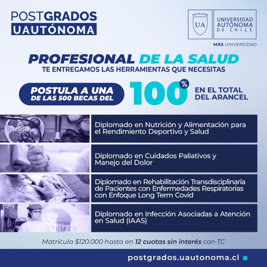 Las postulaciones estarán disponibles, hasta agotar las 500 becas, en el sitio web https://postgrados.uautonoma.cl/beca-profesional-de-la-salud/ donde también las personas encontrarán información sobre otros programas de postgrados impartidos por la Universidad Autónoma de Chile.