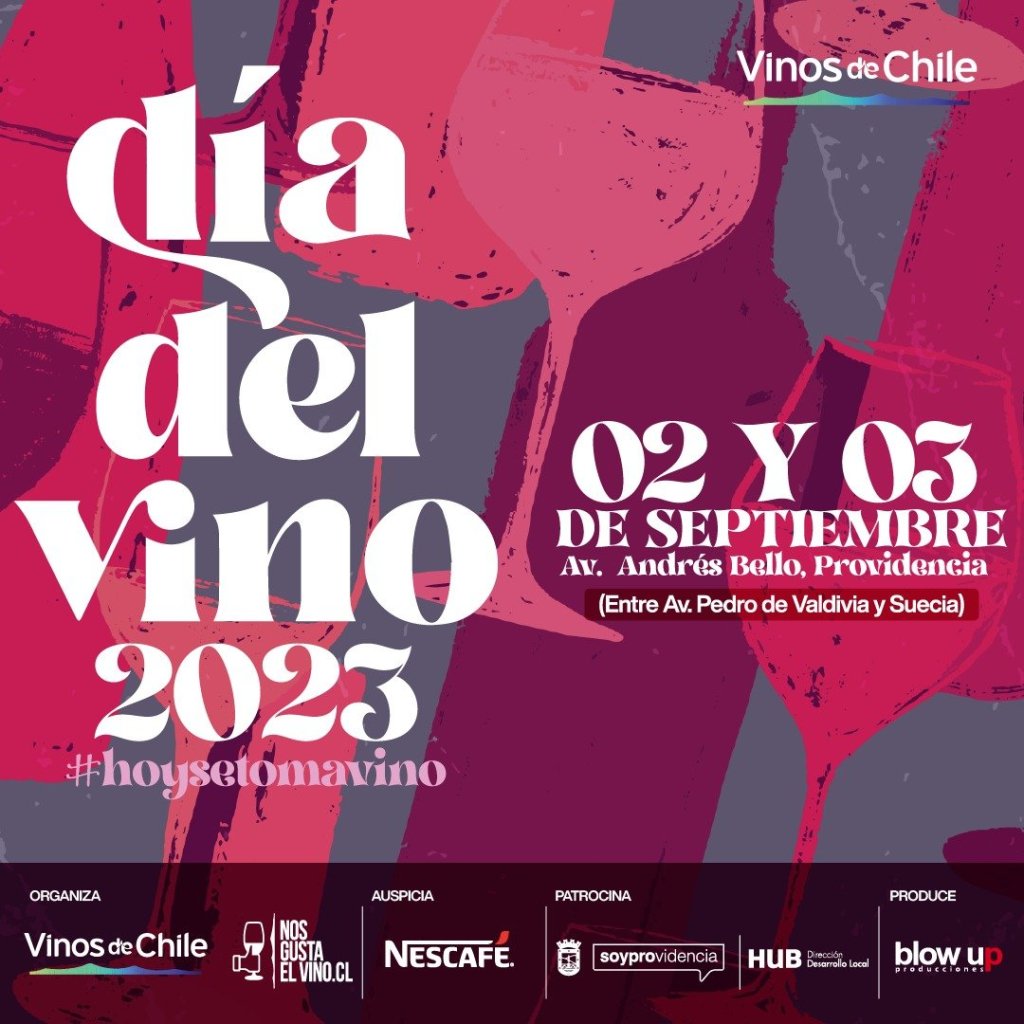 Este año, para celebrar el Día Nacional del Vino, se realizará un gran evento de dos días, el sábado 2 y domingo 3 de septiembre, mostrando la riqueza natural de Chile y de sus vinos. La actividad, organizada por La Mesa del Vino -que incluye asociaciones gremiales, de enólogos, Sommeliers, y los principales valles de Chile, entre otros- junto a la Municipalidad de Providencia, se extenderá por ocho cuadras de la Avenida Andrés Bello,-entre Pedro de Valdivia a Suecia- y contará con más de 40 stands de viñas de todas las regiones vitivinícolas, gastronomía, música en vivo, arte, y emprendedores locales, y busca promover la cultura del vino, educando sobre su calidad, diversidad y beneficios de un consumo responsable.