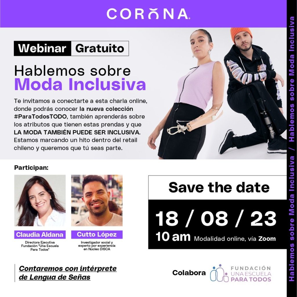 Con el propósito de seguir avanzando hacia la diversidad, Tiendas Corona anunció su webinar “Hablemos sobre Moda Inclusiva”, a realizarse el día 18 de agosto a las 10:00 horas con la participación de la periodista y directora ejecutiva de la Fundación «Una Escuela para Todos», Claudia Aldana, y el investigador social y experto por experiencia en Núcleo DISCA, Mauricio “Cutto” López. En este espacio de conversación, se compartirá la visión y conocimientos de los expositores sobre la importancia de la inclusión en la moda y cómo esta puede ser una herramienta poderosa para la aceptación y el cambio social.