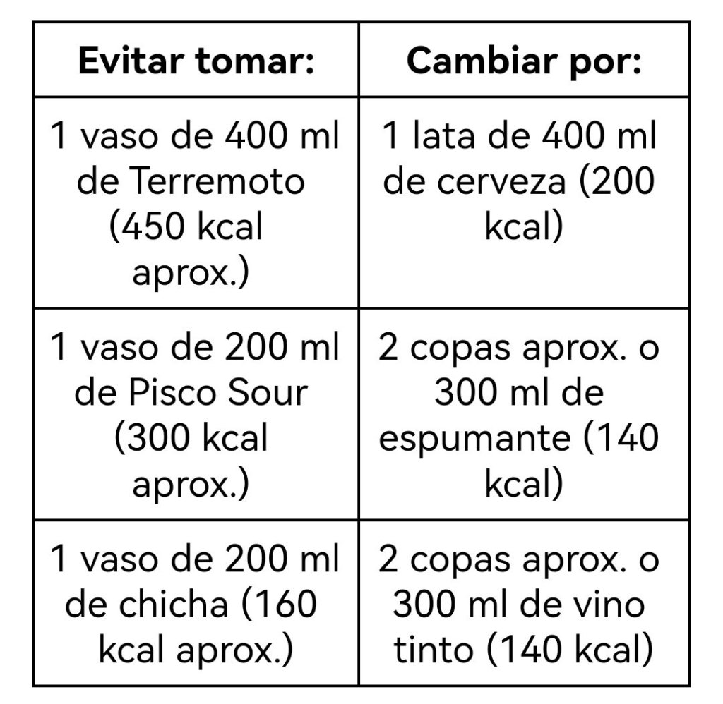 Sobre el alcohol que se consume durante las Fiestas Patrias, el nutricionista explica que su consumo incrementa drásticamente las calorías que se puede ingerir en un día y que, beber alcohol promueve una subida de peso mayor. En ese sentido, entrega una tabla explicativa para consumir los alcoholes con menos calorías durante esta celebración: