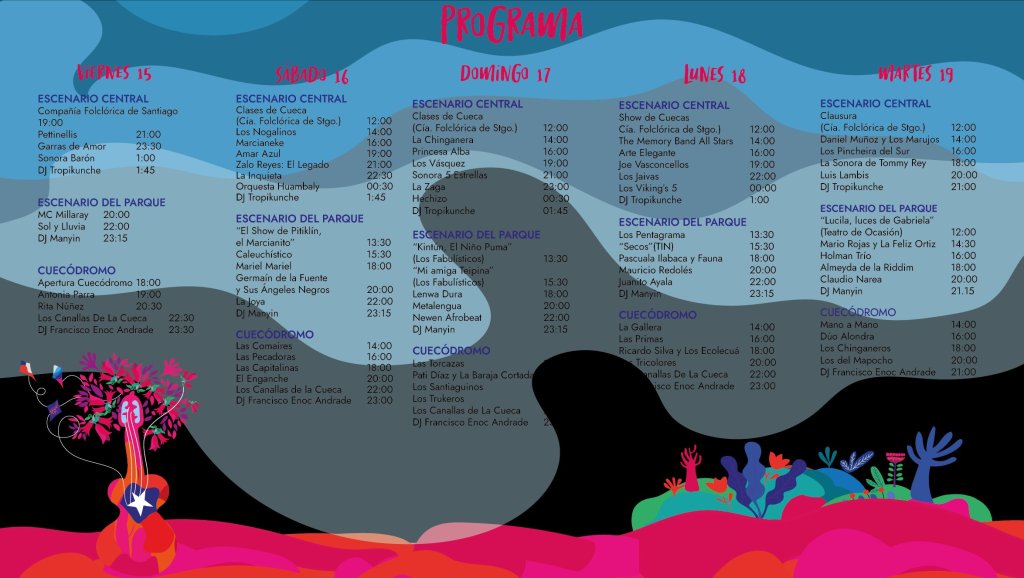 A los grandes nombres anunciados hace algunas semanas, como Petinellis, MC Millaray, Hechizo, Las Capitalinas, Daniel Muñoz y Los Marujos, Los Jaivas, Mariel Mariel, Pascuala Ilabaca y Fauna, La Orquesta Huambaly, Los Viking’s 5 y La Sonora Tommy Rey, entre otros, se suma un nuevo contingente de figuras para reforzar uno de los carteles musicales más potentes de la cartelera nacional: Sonora 5 Estrellas, La Gallera, Sonora Barón, Rita Núñez, Pati Díaz y La Baraja Cortada, Los Trukeros, Los Santiaguinos, Las Torcazas, Holman Trío, Los Canallas de la Cueca, Los Nogalinos, Amar Azul, La Inquieta, Las Pecadoras, Lenwadura, Compañía Folclórica de Santiago, Arte Elegante, El Enganche, Los Pentagrama, Los Pincheira del Sur, Los del Mapocho, Mano a mano, Los Chinganeros, Luis Lambis y los DJ Tropikunche y Francisco Andrade. También habrá clases de cueca a cargo de la Cía. Folclórica de Santiago y obras de teatro familiar como “Secos” (Compañía TIN), “Kintún, El Niño Puma” y “Mi amiga Teipina” (Los Fabulísticos), “Lucila, luces de Gabriela” (Teatro de Ocasión) y “El Show de Pitiklín, el Marcianito”, entre otros.