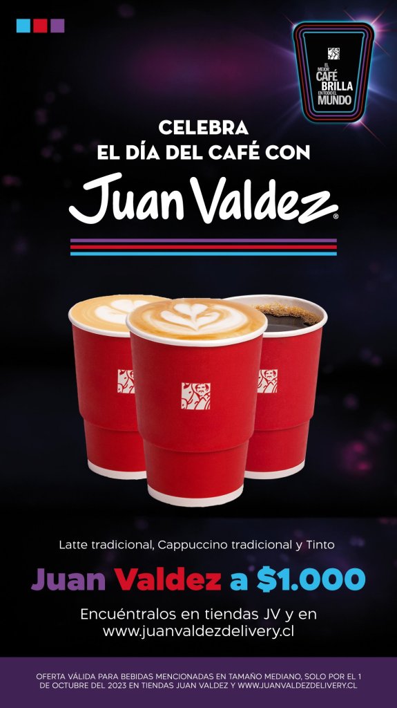 Para que nadie se quede fuera de esta experiencia, la empresa tendrá, solo por ese día, el latte tradicional, el cappuccino tradicional y el tinto Juan Valdez a $1.000. Estas promociones estarán disponibles tanto en las tiendas físicas de todo el país, como en su sitio web www.juanvaldezdelivery.cl.