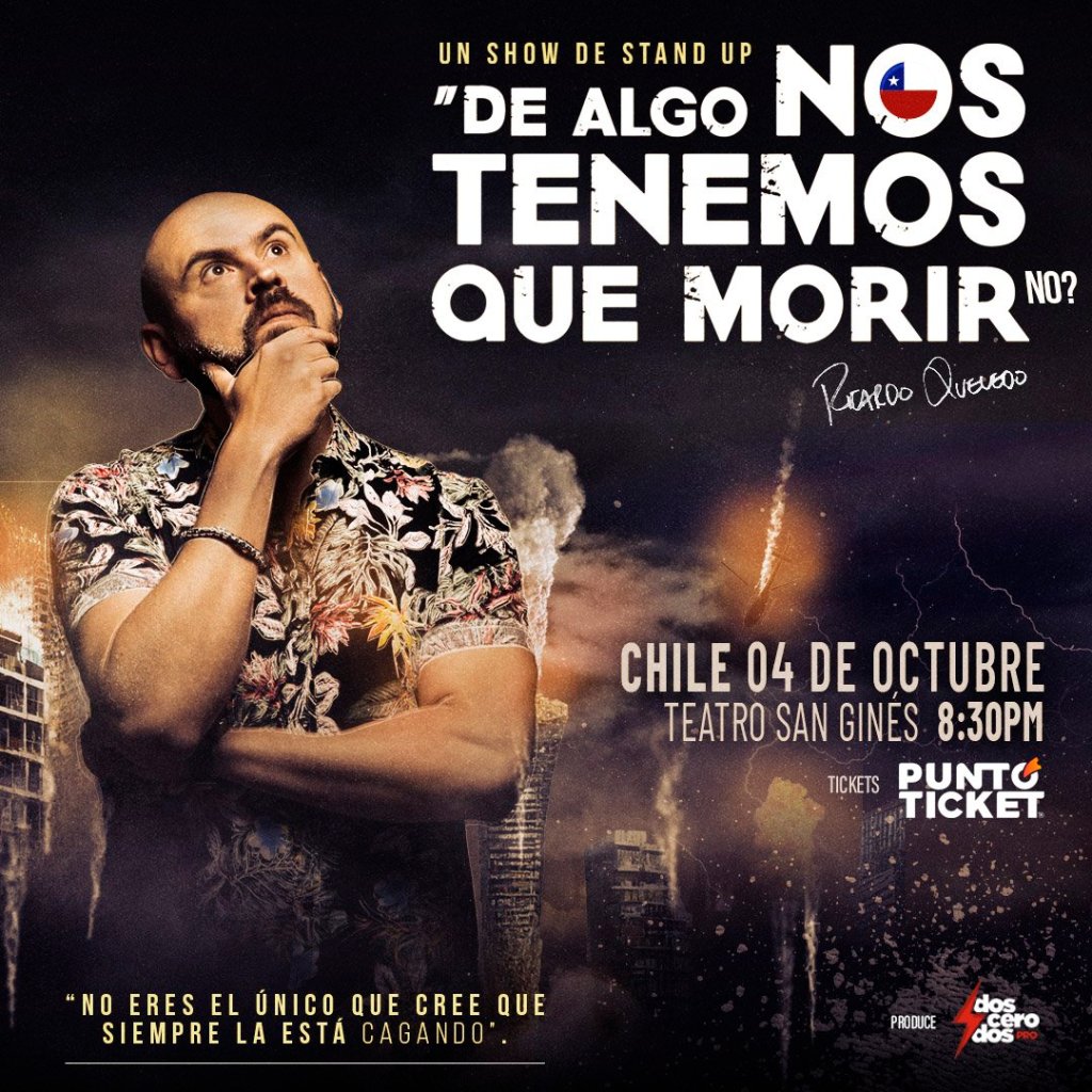 Con un espectáculo de humor totalmente renovado llegará al país Ricardo Quevedo. El actor de origen colombiano, que es todo un éxito en Netflix, ofrecerá en esta oportunidad su show “De algo nos tenemos que morir”, el miércoles 4 de octubre a las 20:30 horas, en el Teatro San Ginés. Entradas disponibles en PuntoTicket.