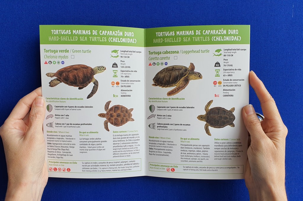 Con esta guía se espera contribuir hacia el conocimiento y cuidado, tanto de las tortugas como de toda la vida marina. «Informamos de manera ilustrativa y didáctica las características de cada tortuga, su importancia, datos curiosos, sus principales amenazas en Chile y qué podemos hacer para ayudarlas y protegerlas», agrega la presidenta de Oceanósfera.