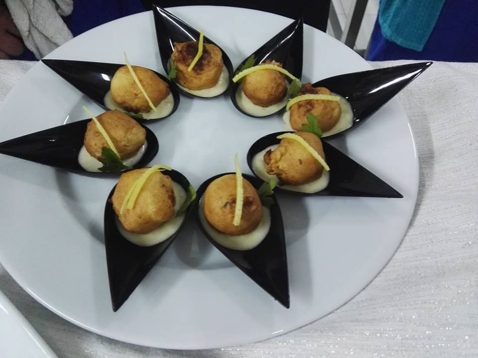 Para abrir el banquete, Gutiérrez propone las «Accras de Merluza», un aperitivo suficientemente contundente para mantener a los comensales entretenidos mientras se ultiman los detalles del plato principal. La combinación de merluza, cebolla, y un toque de ciboulette, envuelto en una masa ligera y frito a la perfección, se sirve sobre una salsa de crema y ralladura de limón, añadiendo un toque de frescura al inicio de la velada.
