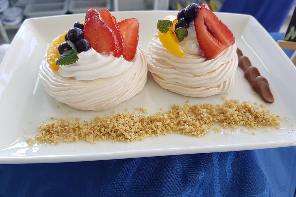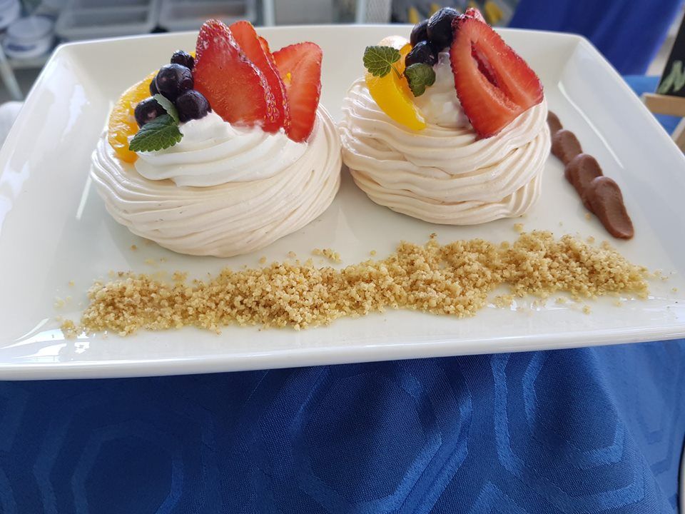 Como colofón a esta experiencia gastronómica, el Chef Gutiérrez nos invita a deleitarnos con una «Pávlova de merengue y frutas de estación». El merengue, preparado con claras de huevo y eritritol, se hornea con esmero hasta obtener una consistencia delicada y crujiente. La corona de frutas frescas de estación, menta y un toque de chocolate bitter sobre una base de crema chantilly, cierra la cena con un toque dulce y ligero.