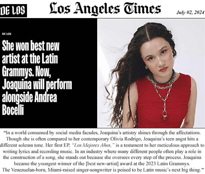 Joaquina, la ganadora más joven del premio ‘Mejor Nuevo Artista’ de los Latin GRAMMYs, es una cantautora y productora graduada de la primera promoción estadounidense del Abbey Road Institute. Como destacada cantautora y multi-instrumentista bicultural, Joaquina da voz a su generación con letras honestas y poéticas, y rápidamente se ha convertido en una de las estrellas emergentes más prominentes del pop latino. Pocos días después de celebrar su cumpleaños, Joaquina, la única artista de música latina invitada, se unió a otros destacados como Seal y Hans Zimmer en un concierto especial. En esta ocasión, Joaquina interpretó «Vivo por ella» a dúo con Andrea Bocelli, enamorando a los 30,000 fans presentes. Además, se unió a Matteo Bocelli para cantar «Honesty» y cerró su actuación con su propio éxito «Rabia».