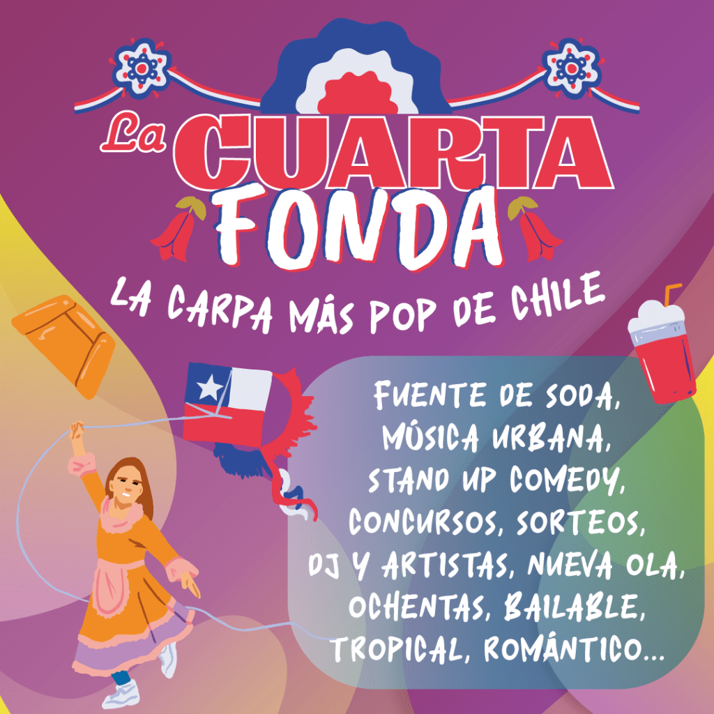 La Cuarta Fonda estará ubicada en una impresionante carpa – la más pop de Chile- de circo con una capacidad para 3.000 personas en rotación, ofreciendo una experiencia única para todos los amantes de las fondas, destacando tanto el espíritu de nuestra cultura y tradiciones, siempre bien representadas por la gastronomía criolla, como las nuevas tendencias en la música y el entretenimiento.