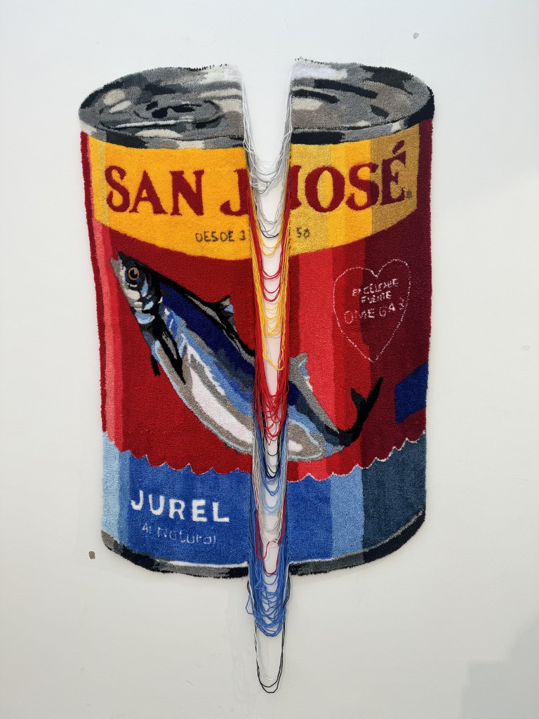 La muestra rescata el imaginario y la iconografía chilena a través de un trabajo textil que representa figuras como, por ejemplo, latas de jurel, ollas tradicionales o bolsas de supermercado, típicas de la cultura de nuestro país.